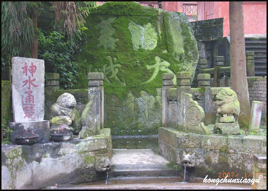从有关资料查获:圣水阁。明万历末为“神水庵”,清初为“圣水阁”,也称“神水阁”。只见阁下路边有一小池,池边有一巨石,上面镌有“大峨”“福寿”四个字,果然,泉水从巨石下溢出,两注流水从池中的小眼里流出,池边立有一牌子“神水通楚”,还有供香的盆。人们取圣水一定是在这里。上得几步石阶,在圣水禅院大门前,矗立一尊高6米的六层石塔。传说是隋朝时期,智凯大师的衣钵塔。智凯大师曾住中峰寺,常来此饮神水。后来他到湖北荆门玉泉寺住持,时常思念峨眉山的神水而不可得。一天他在参禅入定时,见一老人自称龙王,他说玉泉与峨眉山的神水相通,愿为他引来神水。智凯说:“我的钵盂锡杖尚寄在中峰寺内,如能随水而来,我就相信。”于是龙王果真引水浮钵杖而出玉泉洞口。也是“神水通楚”的传说。