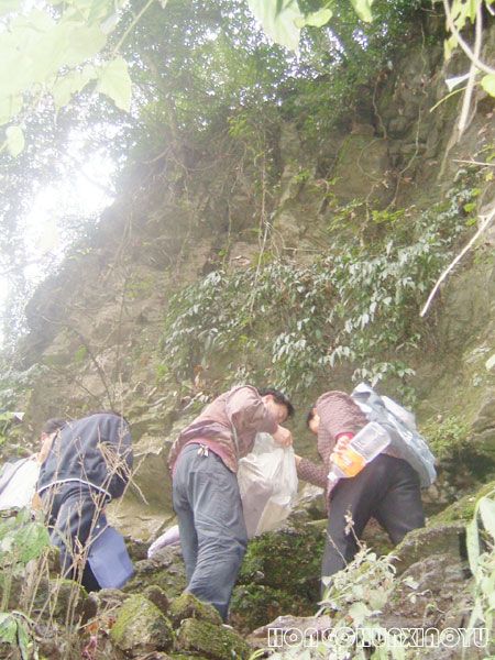 上得一面长长的陡峭的坡,哇,树林,草丛里,有稀疏的雪,回头看看农家的房上也残留着雪痕。再爬上林木丛生的山岩,有冰凝子呢,我小心奕奕经一条羊肠小道平着走过去,见十几号人在排队取水,丈夫为了排队,在半路就把我“甩”了,先到这里。哈哈,此时正轮到他取水。这里也变了,原来是自己带着引水的竹筒,眼下,热情的山民们在洞口接上引水的软管,丈夫装满一瓶递过来,我迫不及待咕噜噜喝了一半,啊!冒着热气的暖水,真舒服,他笑我,看你穷样,在场的人都在笑,说慢慢喝,没人和你争,管你喝个够!呵呵!我摘下眼镜,把余下的半瓶子水浇在镜片上,这是我第一次来这里跟一个老师学的,用水洗镜片格外明净,有很多人用水洗脸洗头。以前我每次来,都要洗脸洗眼镜,可谓醒脑清心明目。只可惜今天取水人太多,身后排着长队,不能在此摸索,洗脸先免了。