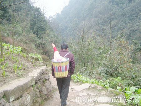 从林中传来欢笑声,一队喜笑逐颜开的村民,哦,原来村里有喜事,看那个背着猪大腿的年青人,是送“离娘肉”,这个地方,“离娘肉”是男方接亲时的重要礼节,必需要送女方父母一块大肉,女方父母才能让男方把人接走,原来时兴肋条肉,现在时兴送一只约三十斤重的一肘猪大腿。天刚刚亮第一队接新娘子的人就去了,他们是第二队接亲的人,等着杀猪取肉,宰下大腿就送走。我立即举起相机,可惜摄影技术太差,只能拍下背肉人的背影,嘿嘿!系着红纸的“离娘肉”还是很惹眼的喔!