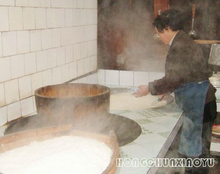 取完水,装好包,转身往回走,农家的屋顶升腾起炊烟,本来想美美的吃一顿豆花饭,不行呀,两妈妈在家,要等我回家做午饭呢。我不余心,还是到张豆花家看看。哈哈,我立即举起相机,卡嚓 拍下她点豆花的情景。