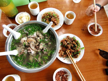用香料和作料把荤腥的牛杂调和至清爽,特别是一碗牛骨汤烫莲花白,真有惊艳的感觉,标准配置每份3含一碗牛杂(或指定纯粹某部件或者自定义组合),牛杂汤烫莲花白一碗,米饭、泡菜、调味碟均管够,若是单纯牛肉或者牛心等特别部件加五毛钱,牛杂是现吃现烫,一般也就一两分钟,吃牛羊肉的调料都不会象别的蘸水一般用红油,只用舂碎的烘烤干辣椒,加上一些盐、味精、香菜,关键是辣椒要新鲜且烘烤恰到好处,才够香,不能吃辣的一般在调味碟里加上汤水,吃得猛的就直接三两下用完再加碟,吃起来爽快淋漓,浑身每个毛孔都放风~~,它是将牛杂洗净、煮熟后切片,吃时用滚烫冒热,佐以新鲜小辣椒蘸碟,深受三轮车夫和挑担卖菜之农夫的喜欢。由于店小,桌凳不够,人们只好各自找座而食,于是各种各样的坐姿都有,有的跷脚弄手,