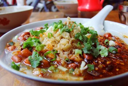 峨眉的豆腐脑和乐山成都的豆腐脑是绝对不一样的,峨眉豆腐脑系骨头汤加调料熬制。一锅熬得很稠的豆粉糊糊,食用豆腐脑时,先用勺打成薄片,盛入碗内,撒上酥肉、黄豆、香菜、葱花、榨菜末、辣椒油、花椒等佐料,色香味俱佳,川味十足。只放佐料的,称为“素豆腐脑”;加粉蒸牛肉,叫“牛肉豆腐脑”;加粉蒸肥肠,叫“肥肠豆腐脑”;加生鸡蛋,则叫“蛋冲豆腐脑”。