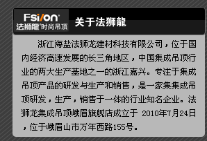 法狮龙人秉承“专注、专业”的发展精神,在集成吊顶行业内一直以优良的技术、研发优势和准确的市场定位而领先于行业。2005年法狮龙研制出第一代集成吊顶产品,并成功获得国家相关专利(专利号:ZL200320113874.5)。最近公司又投入巨额资金对传统的企业生产设备进行改进,用目前行业先进的液压设备取代原有的老式冲压设备,使法狮龙生产的每一件产品的质量都更上一层楼,也使每一件产品的品质都更具市场竞争力。