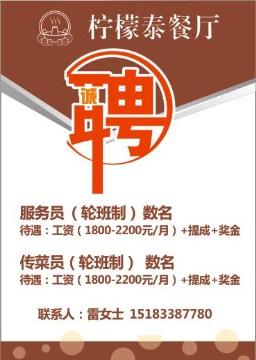 招聘:吧员,服务员,传菜员!任职要求:五官端正,吃苦耐劳,工作认真负责,善于沟通,注重团队精神!