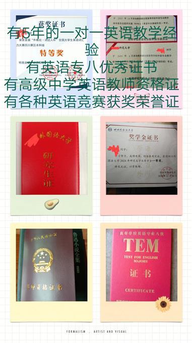 工作经历:英语硕士研究生,本硕都是重点一本师范大学英语师范专业,有5年的一对一家教经验,帮很多学生提高英语成绩,寒假回峨眉帮助更多需要提升英语成绩的学生