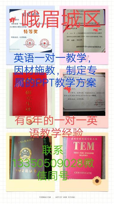 工作经历:本硕都是重点一本师范大学英语师范专业的在读研究生,有在成都5年的一对一家教经历,有丰富的教学经验和方法,有高级中学教师资格证,有全国英语专业八级优秀证书,有全国英语竞赛获奖荣誉证书等等,高中的时候是理科生,高考成绩超过重本线70多分,数学英语物理化学都可以,因材施教原则,根据个人情况制定专属PPT教学方案,查缺补漏拓展培优等等,有需要在寒假期间提升英语成绩的可以联系我