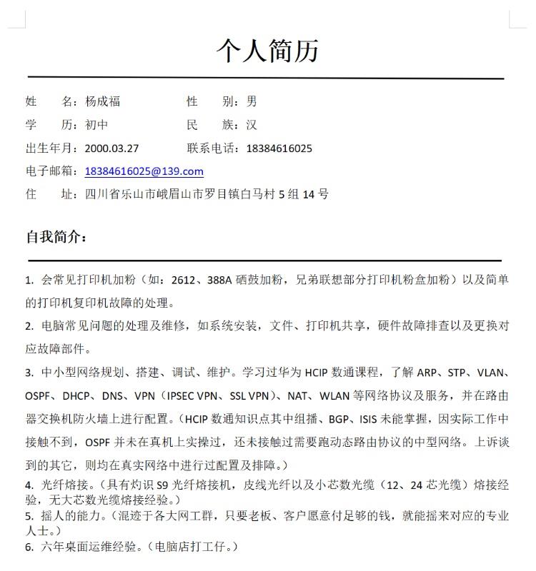 电脑维修,网络维护,打印机复印机维护,光纤熔接,详细简历下图。